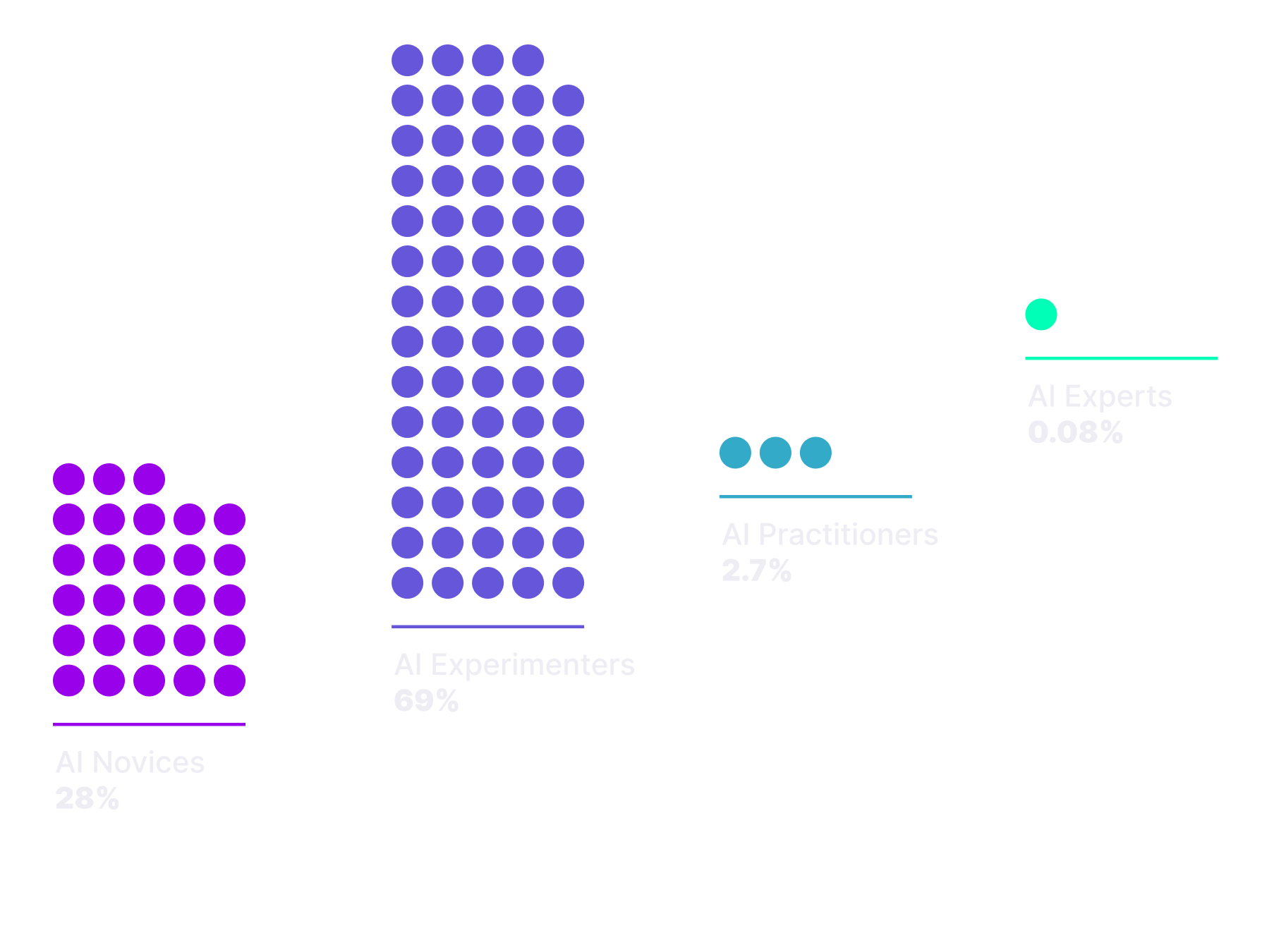 70% of the workforce are what we call “AI experimenters” - people who use AI for very basic tasks,like summarizing meeting notes, rewriting emails, and getting quick answers. The second-largestgroup are “AI novices” - those who don’t use AI, or have tried it a few times before bouncing off.