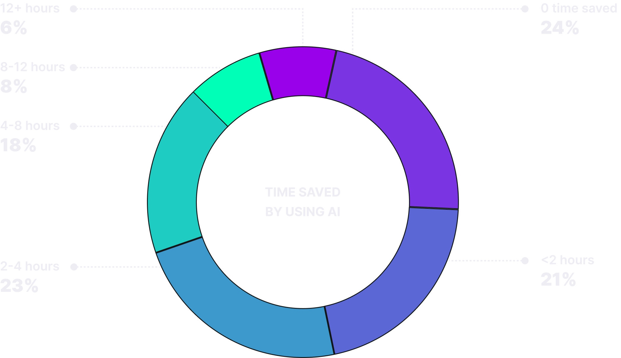 Because most workers are using AI for very basic tasks, the impact to their productivity is minimal.Nearly a quarter of the workforce (24%) reports saving no time with AI. Another 44% say they save less than 4 hours per week.