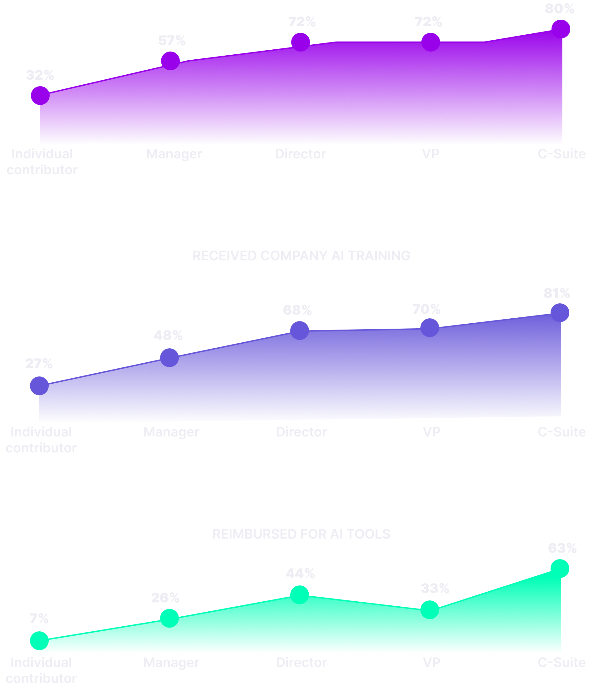 Individual contributors - defined as knowledge workers who do not manage a team - currently benefit the least from their company’s AI resources. They’re the least likely of all career stages to have clear access to anAI tool, tool reimbursement, or AI training.