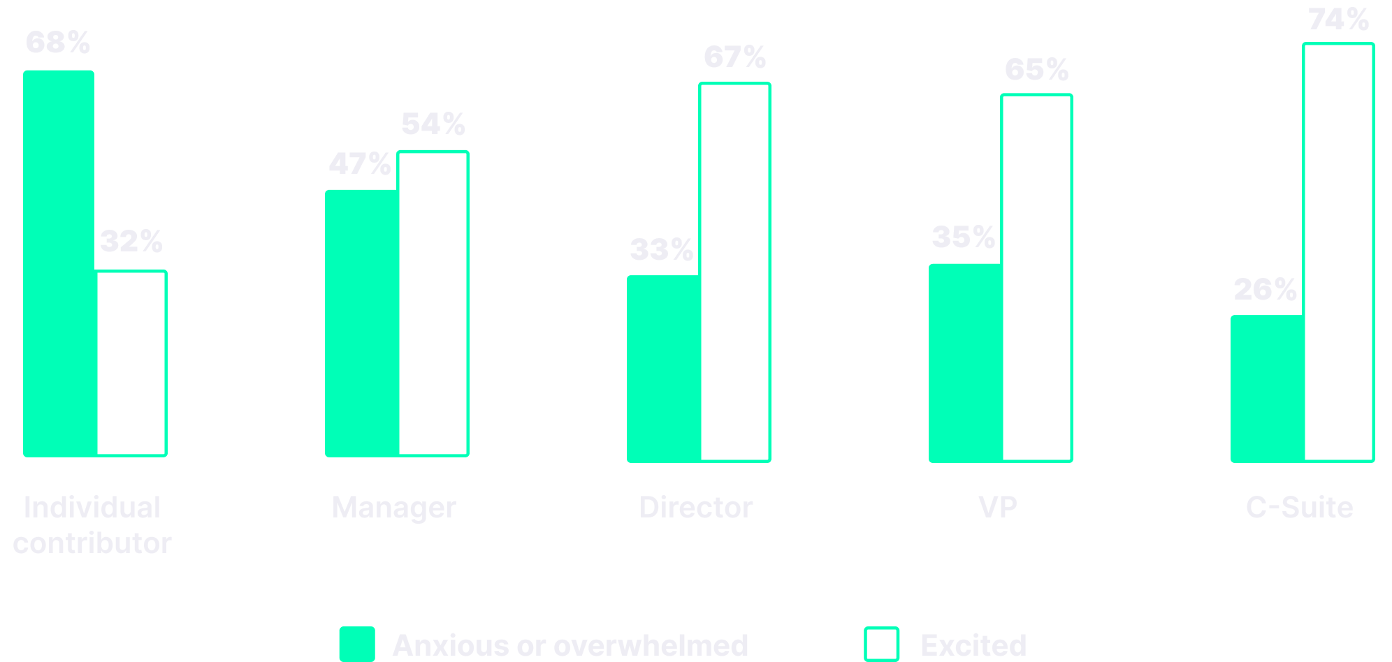 As a result, they’re more likely to be anxious or overwhelmed by AI, less likely to trust it, and least likely to say it’s having a transformative impact on their work.