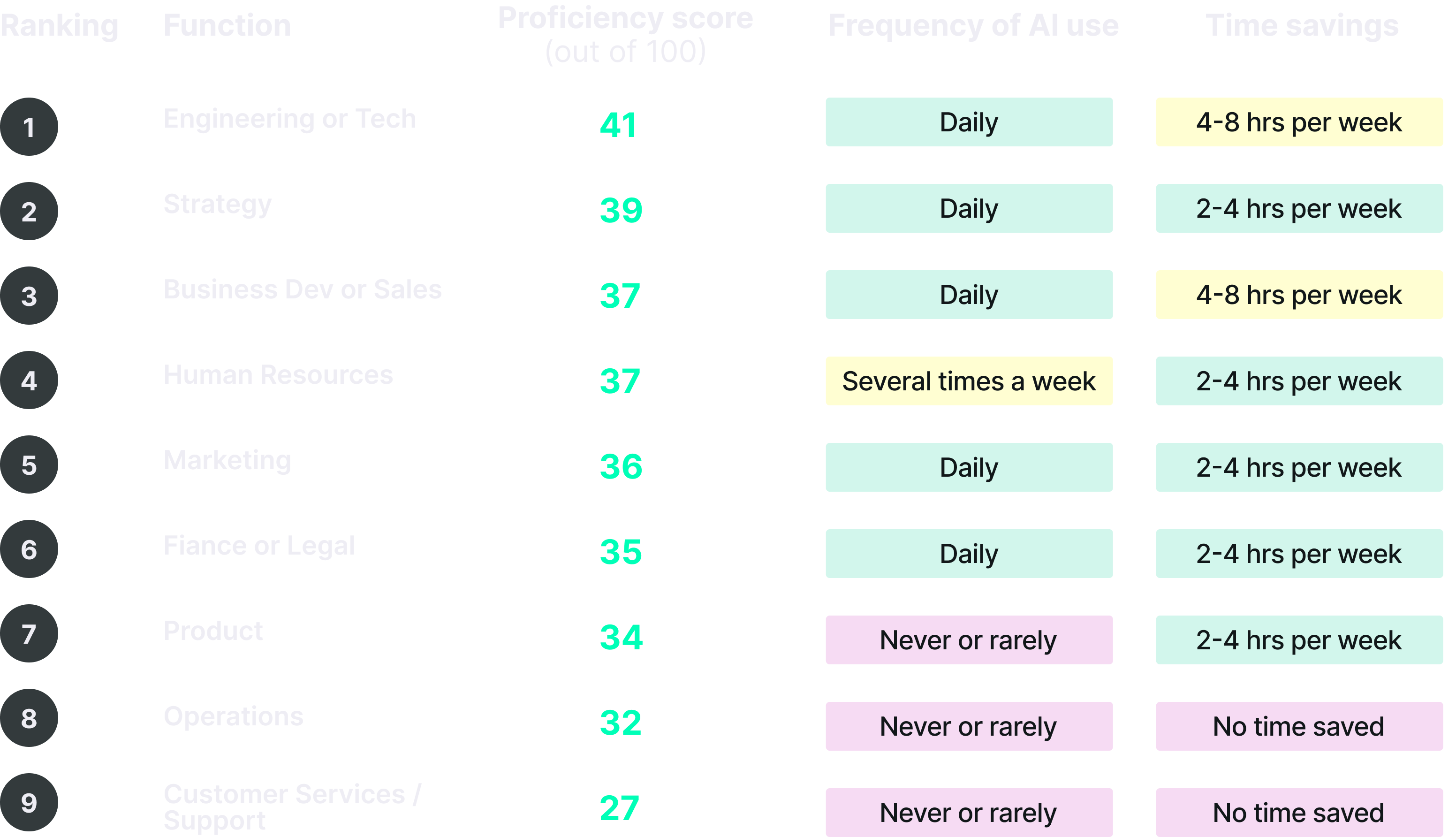 Engineering, strategy, and business development departments lead in AI proficiency - through their proficiency scores are still quite low.