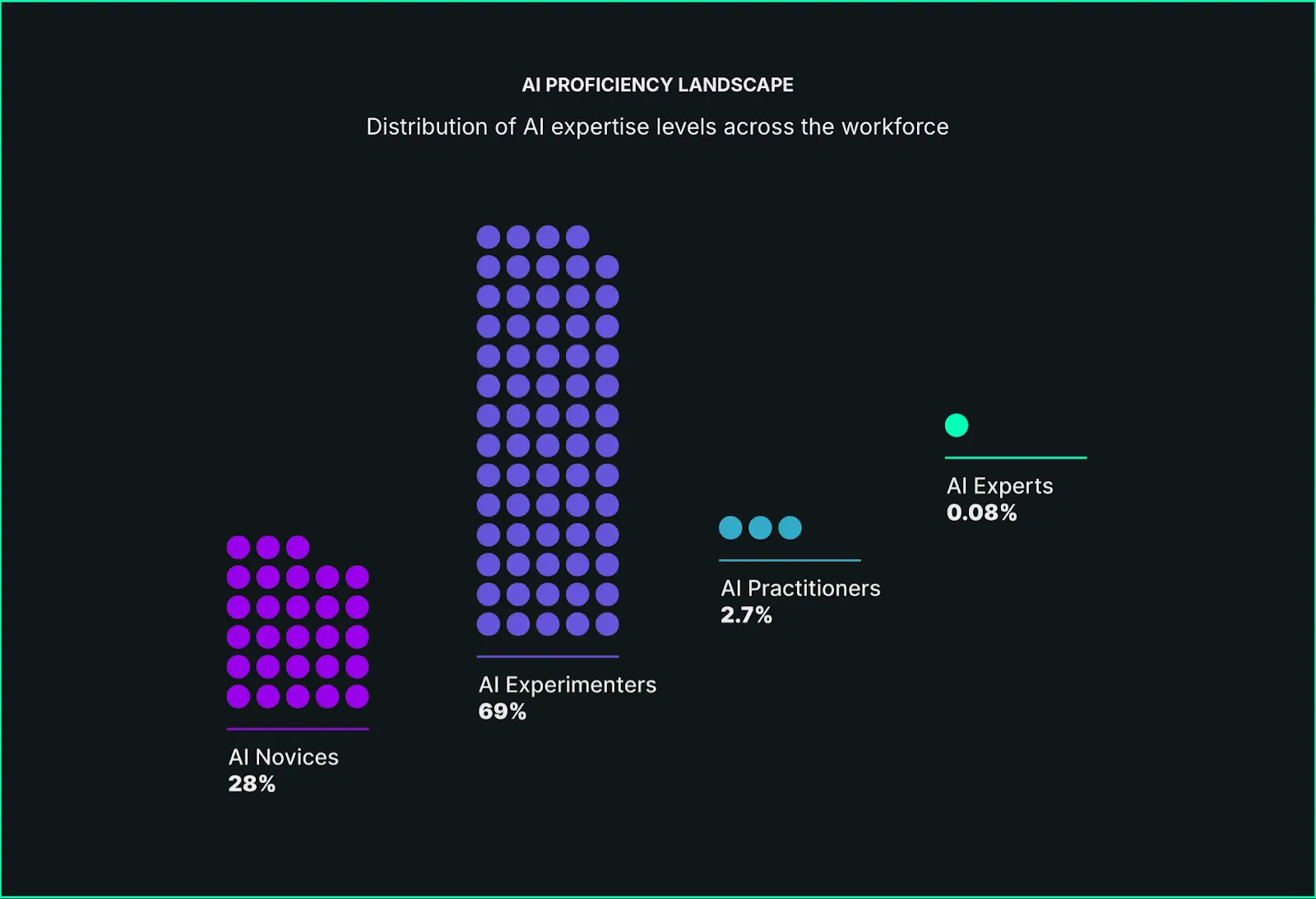 - The bar for AI proficiency is rising, but employees aren’t meeting it. AI’s capabilities have accelerated in the last year, but 70% of employees are still what we call “experimenters” - meaning they prompt poorly and use AI for very basic use cases. Less than 3% are using AI in ways that will generate significant time savings and ROI.