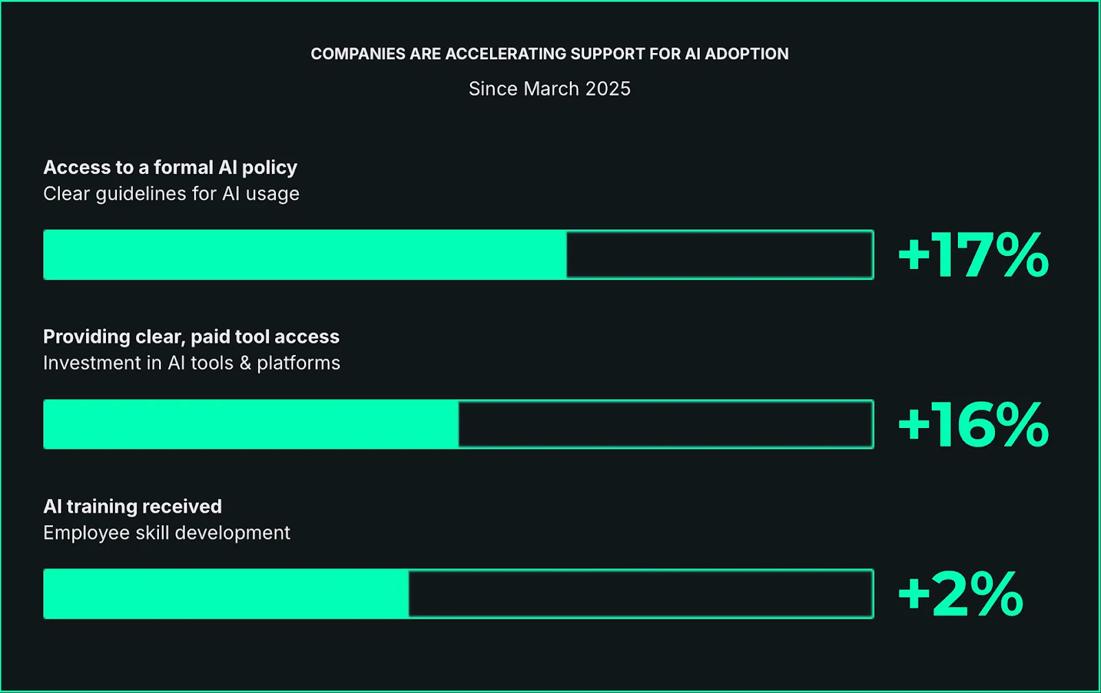 A lot of companies are making the “right” investments – workers are 17% more likely to have access to a formal policy, 16% more likely to have clear tool access, and 2% more likely to receive AI training. But they’re not moving the needle, because these actions are built to create AI beginners.