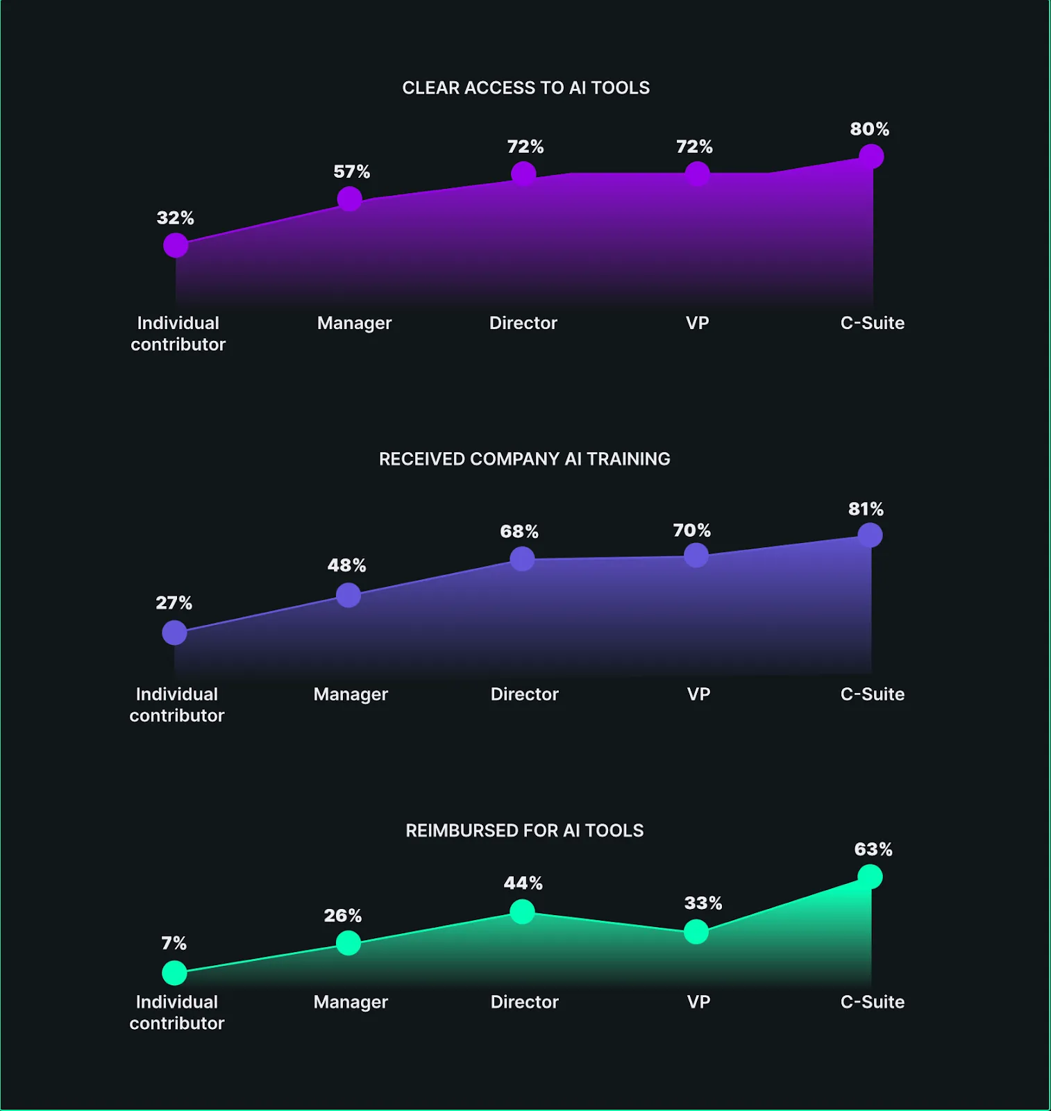 Relatedly, only 32% of ICs say they have access to AI tools, versus 80% of the C-suite, and 27% of ICs get access to AI training versus 81% of the C-suite.