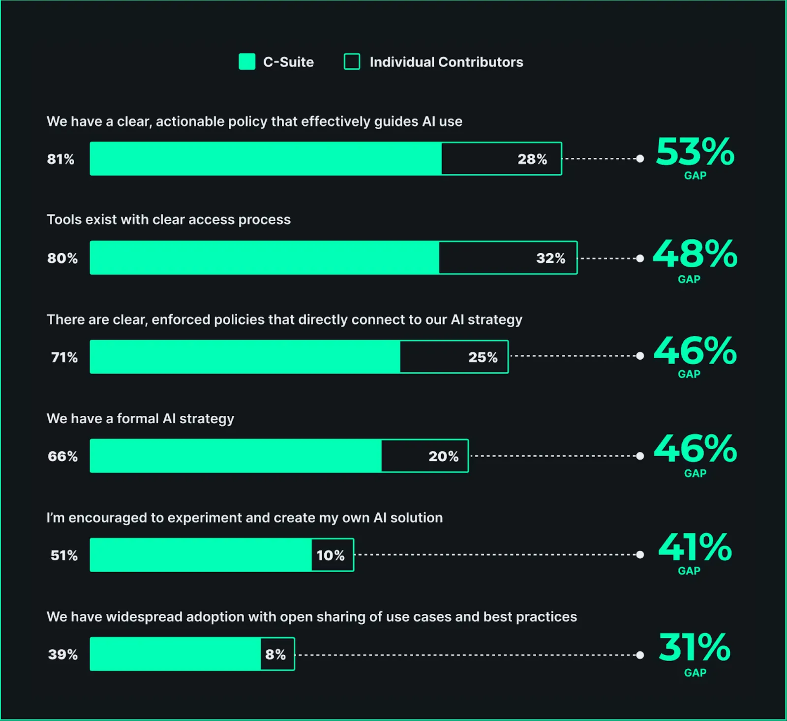 Your top-line leaders need to be informed about how their teams feel about and use AI – and they should be able to understand how company strategy is influencing use and sentiment. Right now, they have a very different perception of how their AI initiatives are going than their employees.