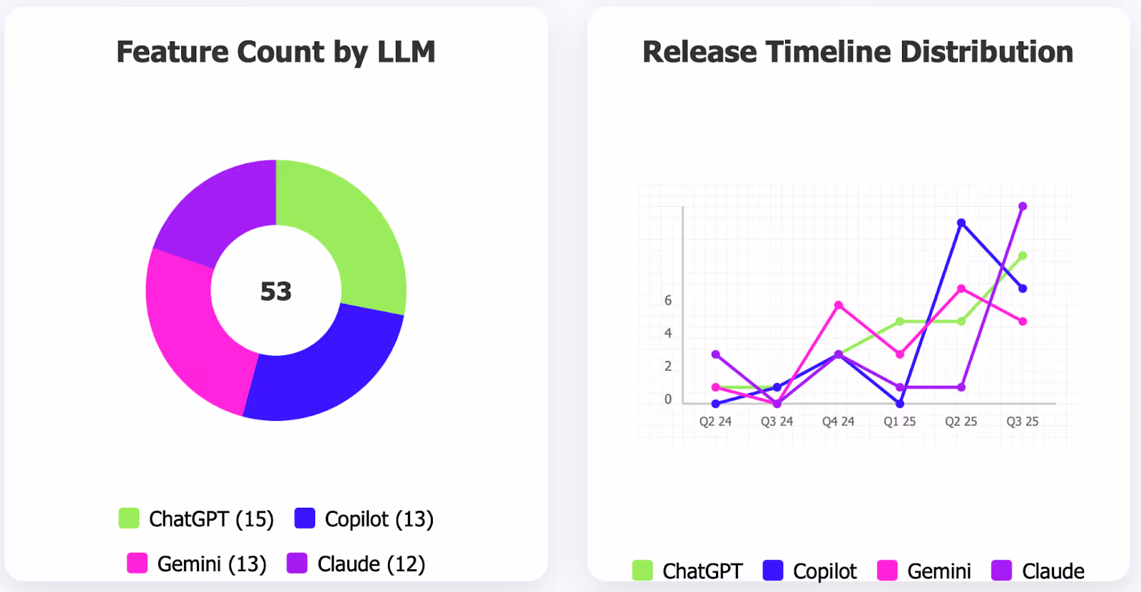 Beyond the models themselves, these LLMs had 53 new feature releases in the last year.