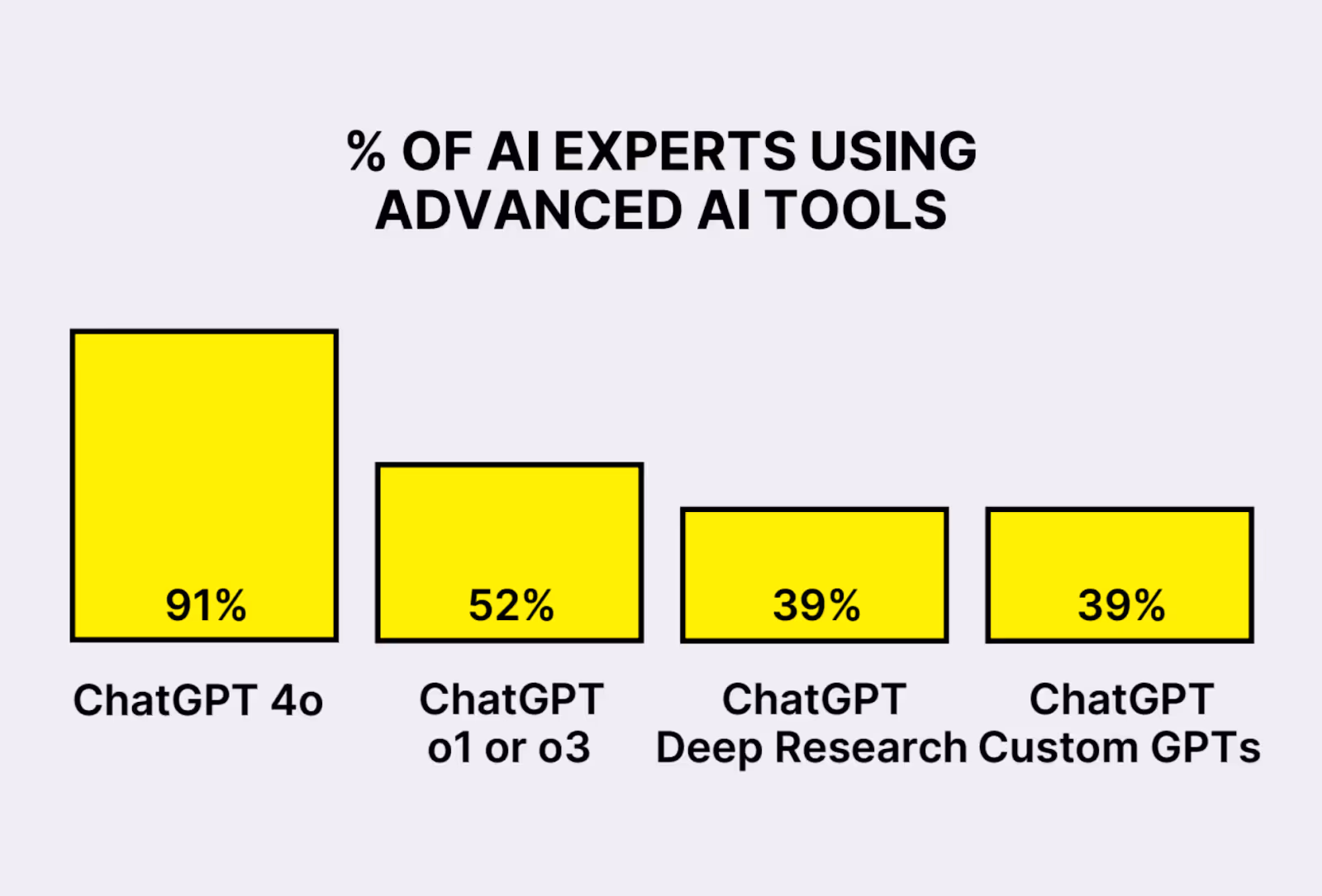 The vast majority were using ChatGPT’s default model at the time of survey. Only about half had tried a reasoning model. Less than 40% had deployed a custom GPT.